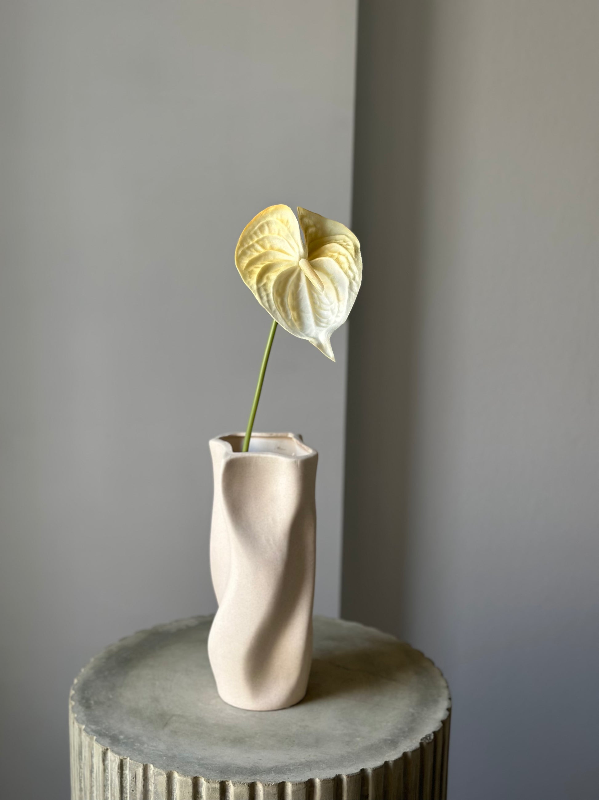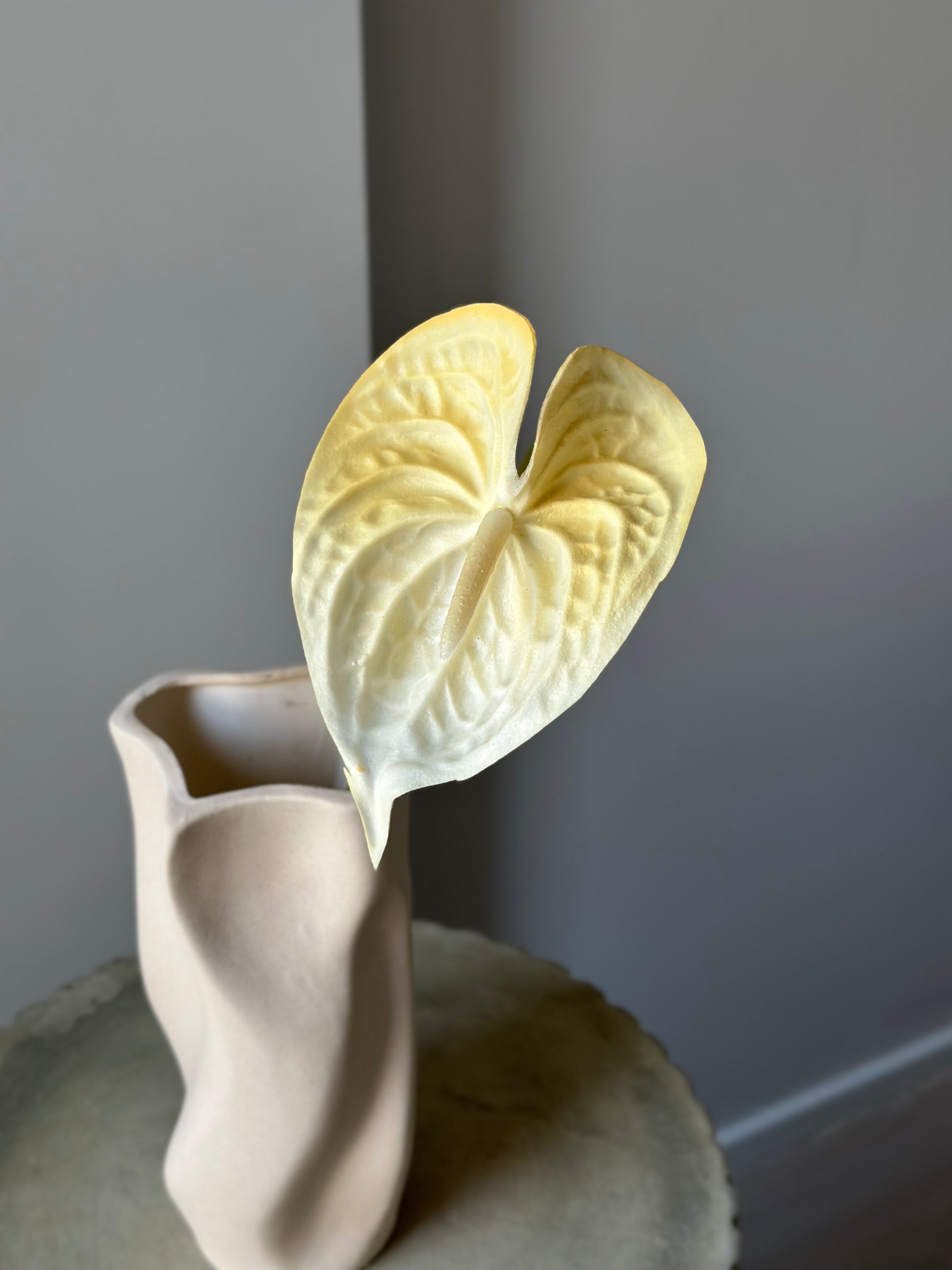 Denne kunstige anthurium i en butter yellow nuance tilfører et elegant, tropisk touch til enhver indretning. Det bløde, hjerteformede blomsterhoved føles næsten som ægte, og dens varme farve skaber liv og karakter uden behov for vedligeholdelse.